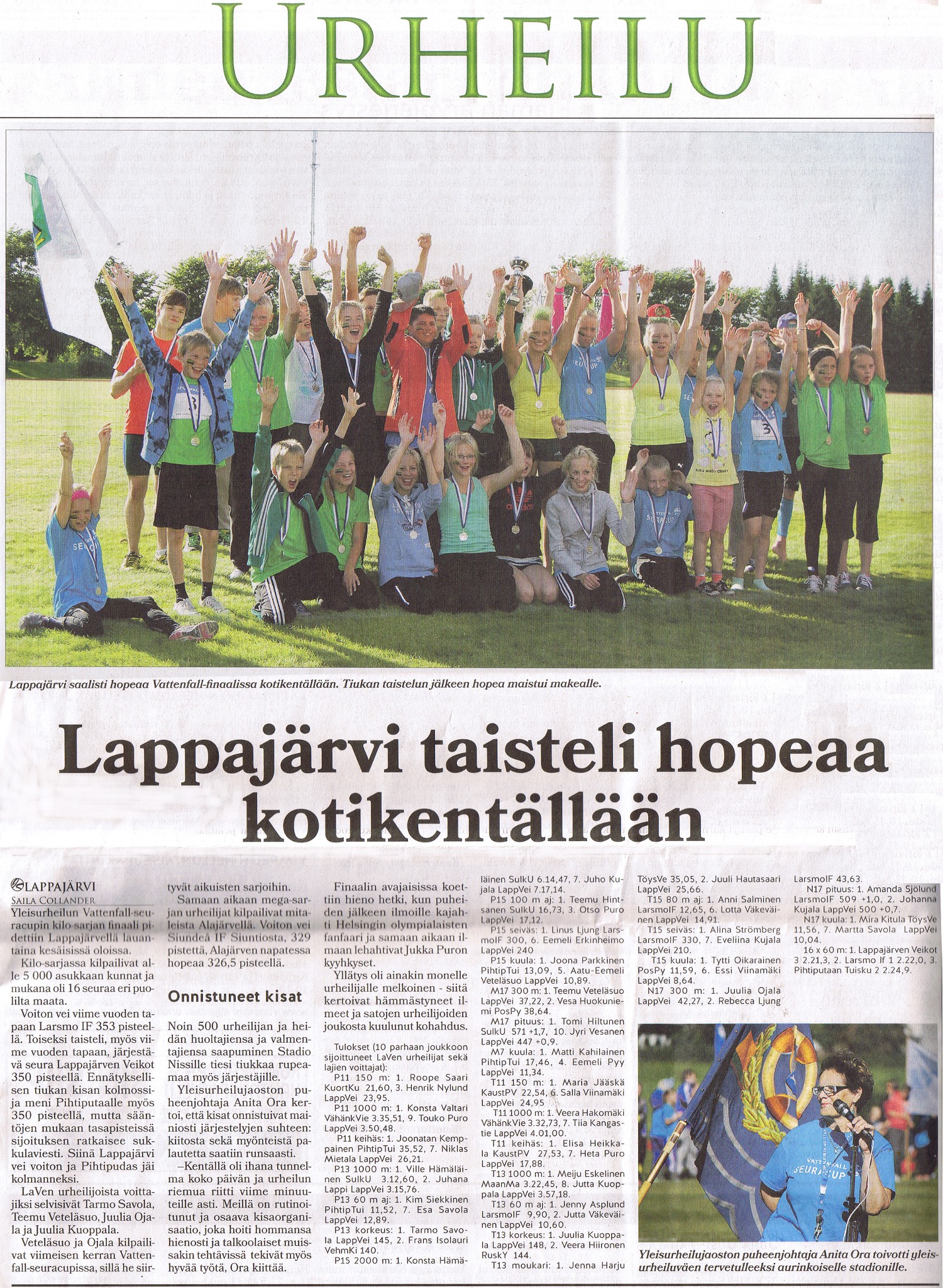 Lappajärven Veikkojen yleisurheilujoukkue nappasi kotikentällään Stadio Nissillä hienosti hopeaa valtakunnallisessa Vattenfall-finaalissa! Tämä oli jo viides peräkkäinen mitalisijoitus LaVelle, mikä kertoo hienoista urheilijoista, valmentajista ja taustajoukoista.