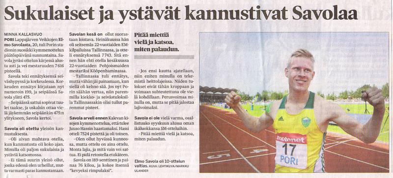 Lappajärven Veikkojen Elmo Savola osallistui 13.-14.6. Tanskassa Tårnbyssä moniottelujen Pohjoismaiden mestaruuskisaan. Viime vuonna kultaa tuli M19-sarjassa. Sarjan vaihto ikäluokkaa ylemmäs ei vaikuttanut, vaan hän uusi kullan tuloksella 7244 pistettä.